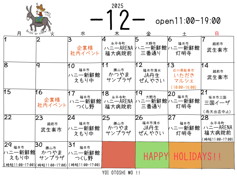2025年12月の出店カレンダーです営業時間は11:00〜19:00です(閉店時間はご注文状況により延長する場合もあります)その他の詳細早めに完売する場合などはInstagramでお知らせしています! 皆様のお越しをお待ちしています! いつ...
