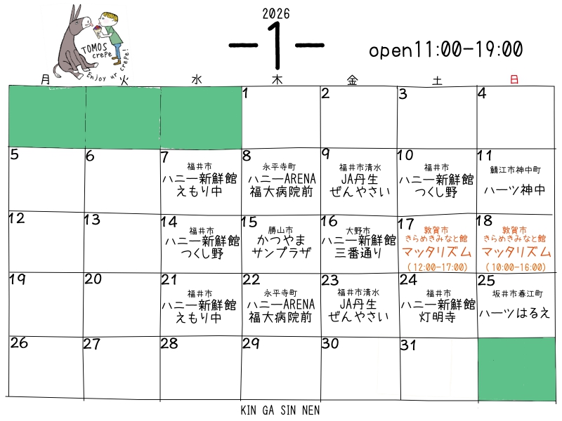 予定 2026年1月のカレンダー! 2026年1月の出店カレンダーです営業時間は11:00〜19:00です(閉店時間はご注文状況により延長する場合もあります)その他の詳細早めに完売する場合などはInstagramでお知らせしています! 皆様のお越しをお待ちしています! いつも... 2025.11.21 予定未分類