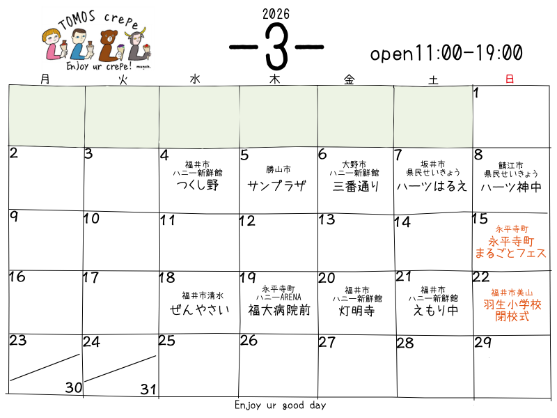 予定 2026年3月のカレンダー! 2026年3月の出店カレンダーです営業時間は11:00〜19:00です(閉店時間はご注文状況により延長する場合もあります)その他の詳細早めに完売する場合などはInstagramでお知らせしています! 皆様のお越しをお待ちしています! いつも... 2026.01.30 予定未分類
