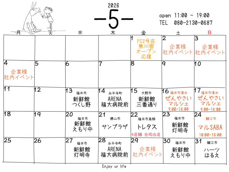 予定 2026年4月のカレンダー! 2026年4月の出店カレンダーです営業時間は11:00〜19:00です(閉店時間はご注文状況により延長する場合もあります)その他の詳細早めに完売する場合などはInstagramでお知らせしています! 皆様のお越しをお待ちしています! いつも... 2026.01.30 予定未分類