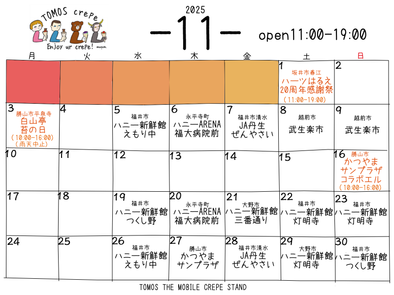 2025年11月カレンダー! 予定 2025.11.012025.11.21 2025年11月の出店カレンダーです営業時間は11:00〜19:00です(閉店時間はご注文状況により延長する場合もあります)その他の詳細早めに完売する場合などはInstagramでお知らせしています! 皆様のお越しをお待ちしています!いつもありがとうございます☆